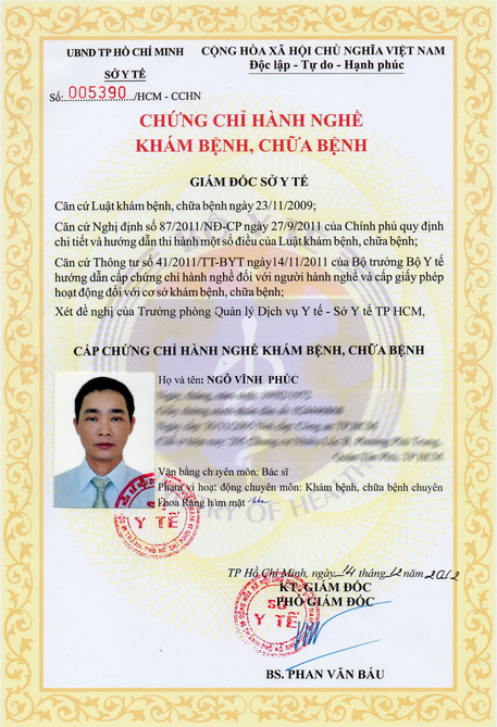 Sở hữu chứng chỉ hành nghề khám bệnh, chữa bệnh số 005390/HCM-CCHN do Sở Y Tế TP.HCM cấp ngày 14/12/2012