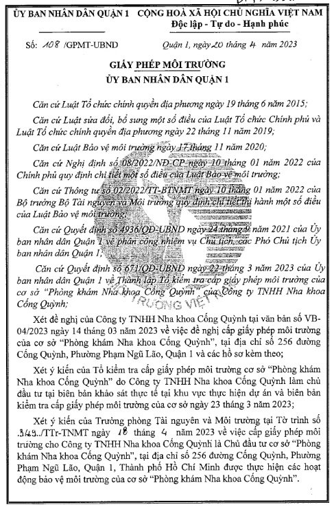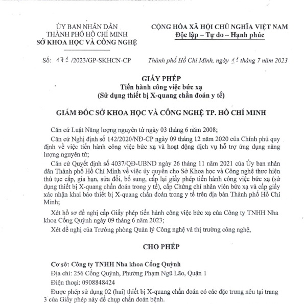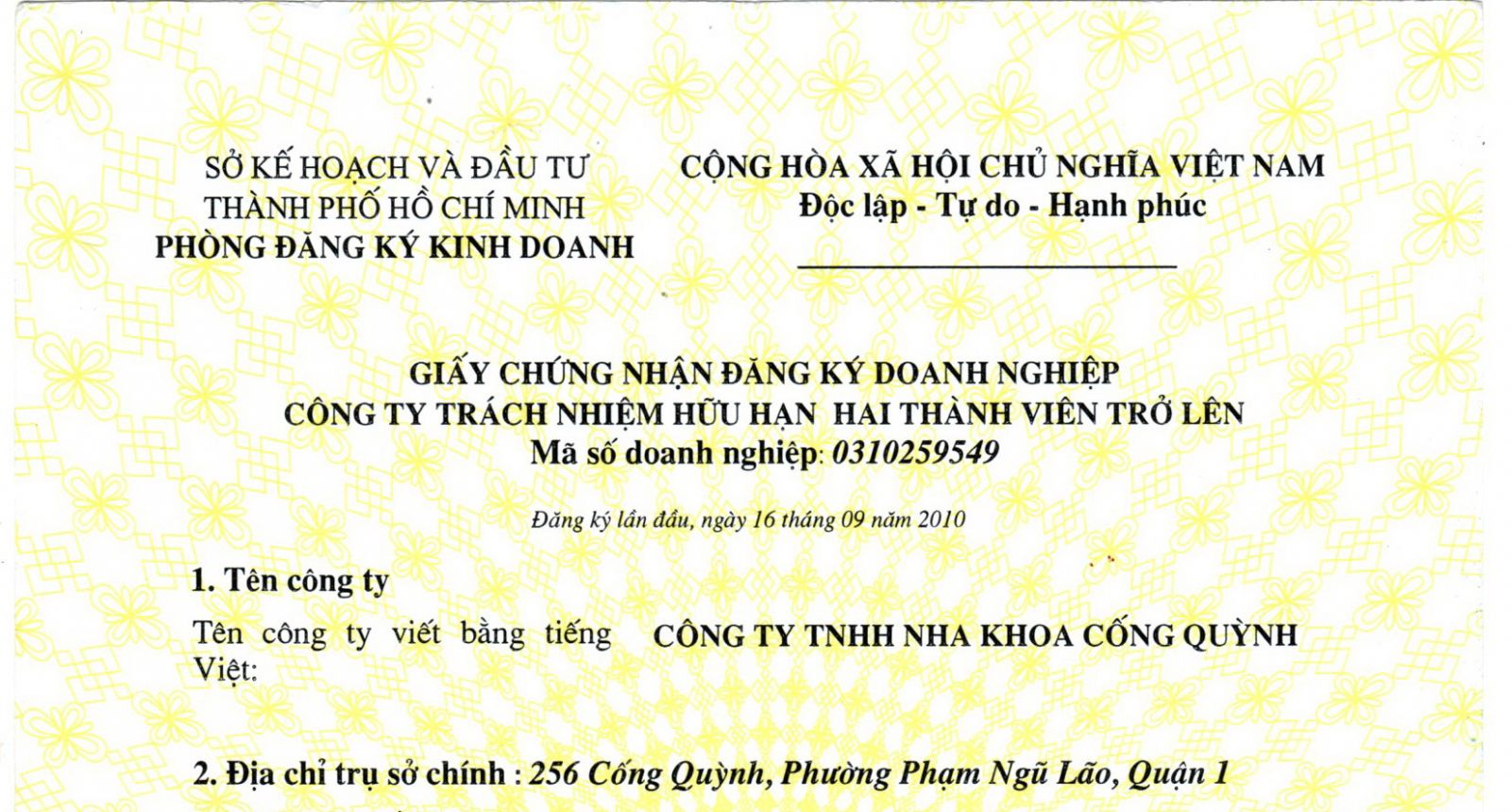 Nha Khoa Cống Quỳnh được thành lập theo giấy phép số: 0310259549 (Sở Kế Hoạch Và Đầu Tư TP.HCM) và Giấy Phép Hoạt Động Khám Bệnh, Chữa Bệnh số: 02257/SYT-GPHĐ (Sở Y Tế TP.HCM) Cấp Phép Khám và Chữa Bệnh Răng Hàm Mặt.