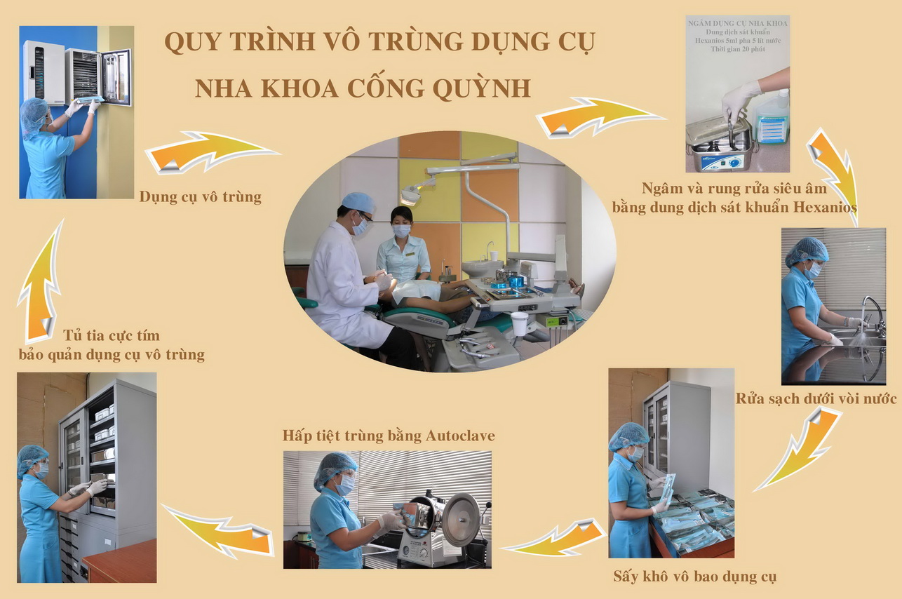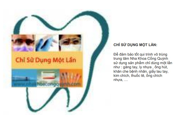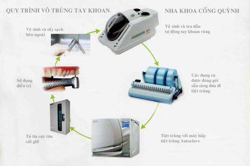 Nha Khoa Cống Quỳnh thực hiện thông tư số 18/2009/TT/BYT về việc Hướng dẫn tổ chức thực hiện công tác kiểm soát nhiễm khuẩn trong các cơ sở khám bệnh, chữa bệnh của Bộ Y Tế cũng như tuân thủ đầy đủ qui trình khử khuẩn của Sở Y Tế Tp.HCM và hướng dẫn kiểm soát nhiễm khuẩn trong nha khoa của hiệp hội nha khoa Hoa kỳ (American Dental Assciation).