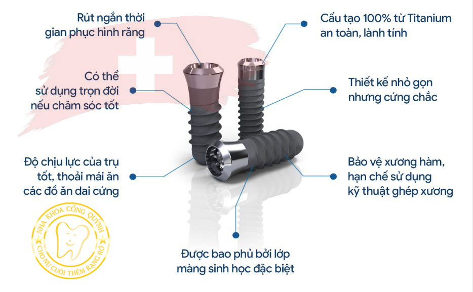 Trụ Implant Thụy Sĩ được sản xuất theo tiêu chuẩn nghiêm ngặt của ngành nha khoa Thụy Sĩ – quốc gia nổi tiếng về các công nghệ y khoa chính xác. Trụ được làm từ Titanium tinh khiết, tương thích sinh học cao, giúp tích hợp xương nhanh và bền vững.